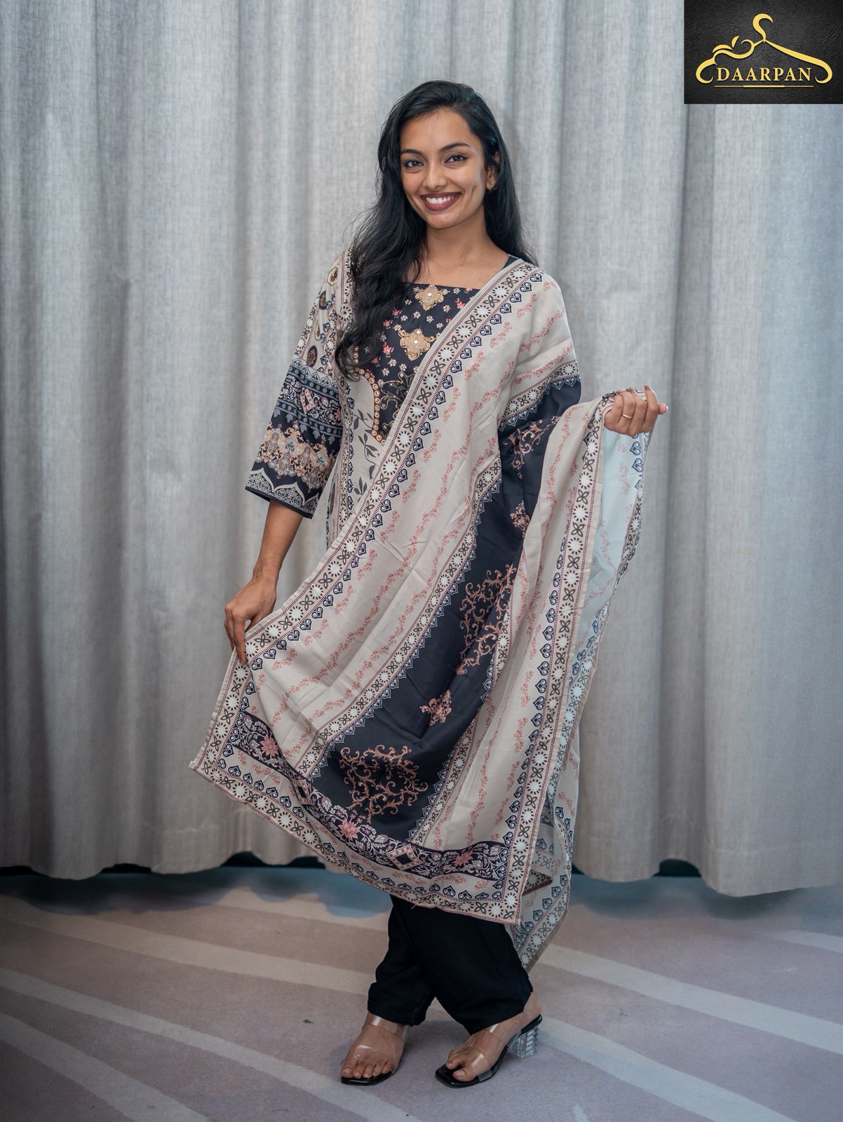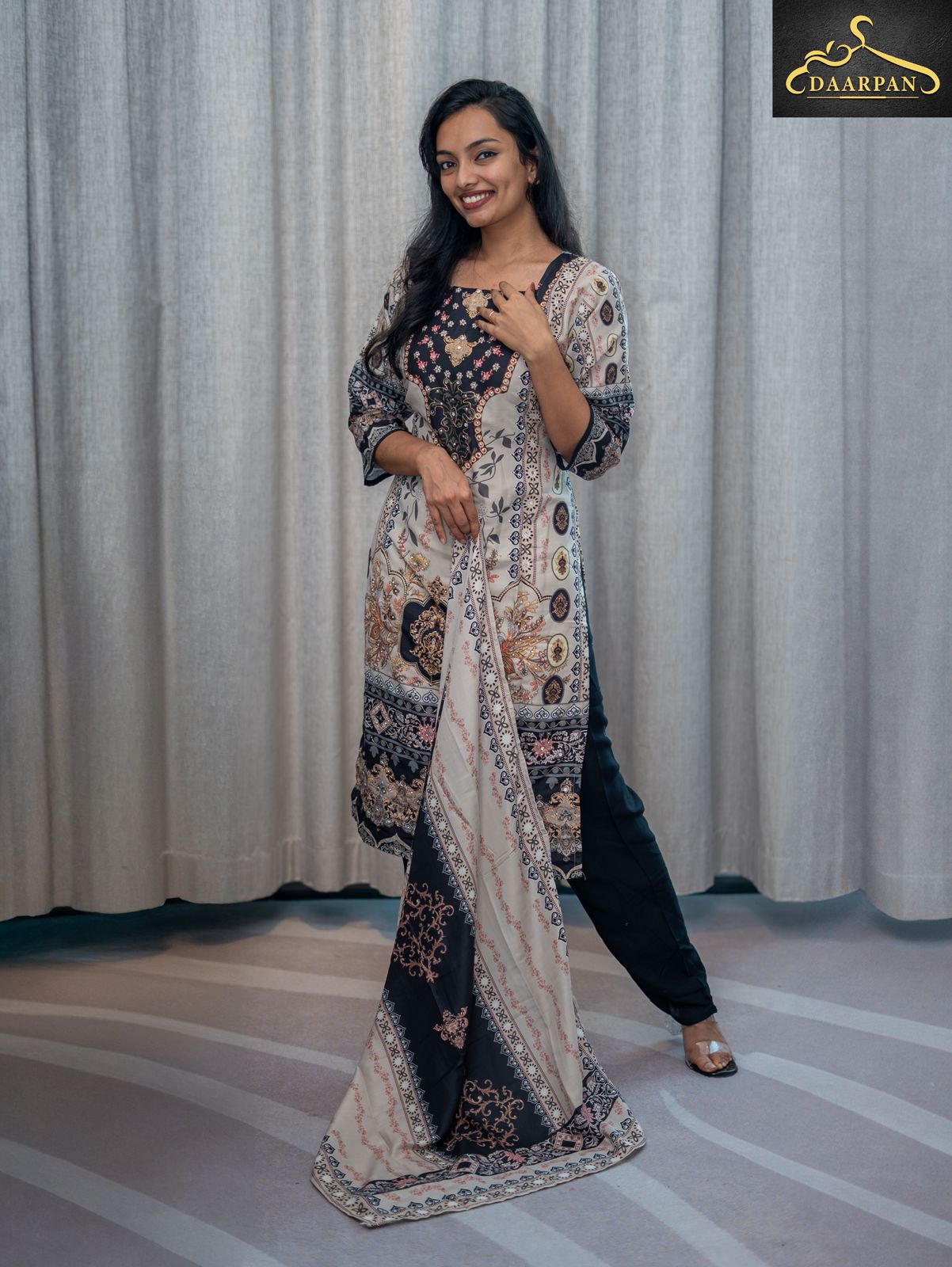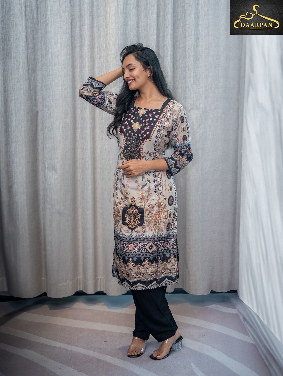 •The bottom is a pair of black straight-fit pants, balancing the detailed prints of the kurta and dupatta.