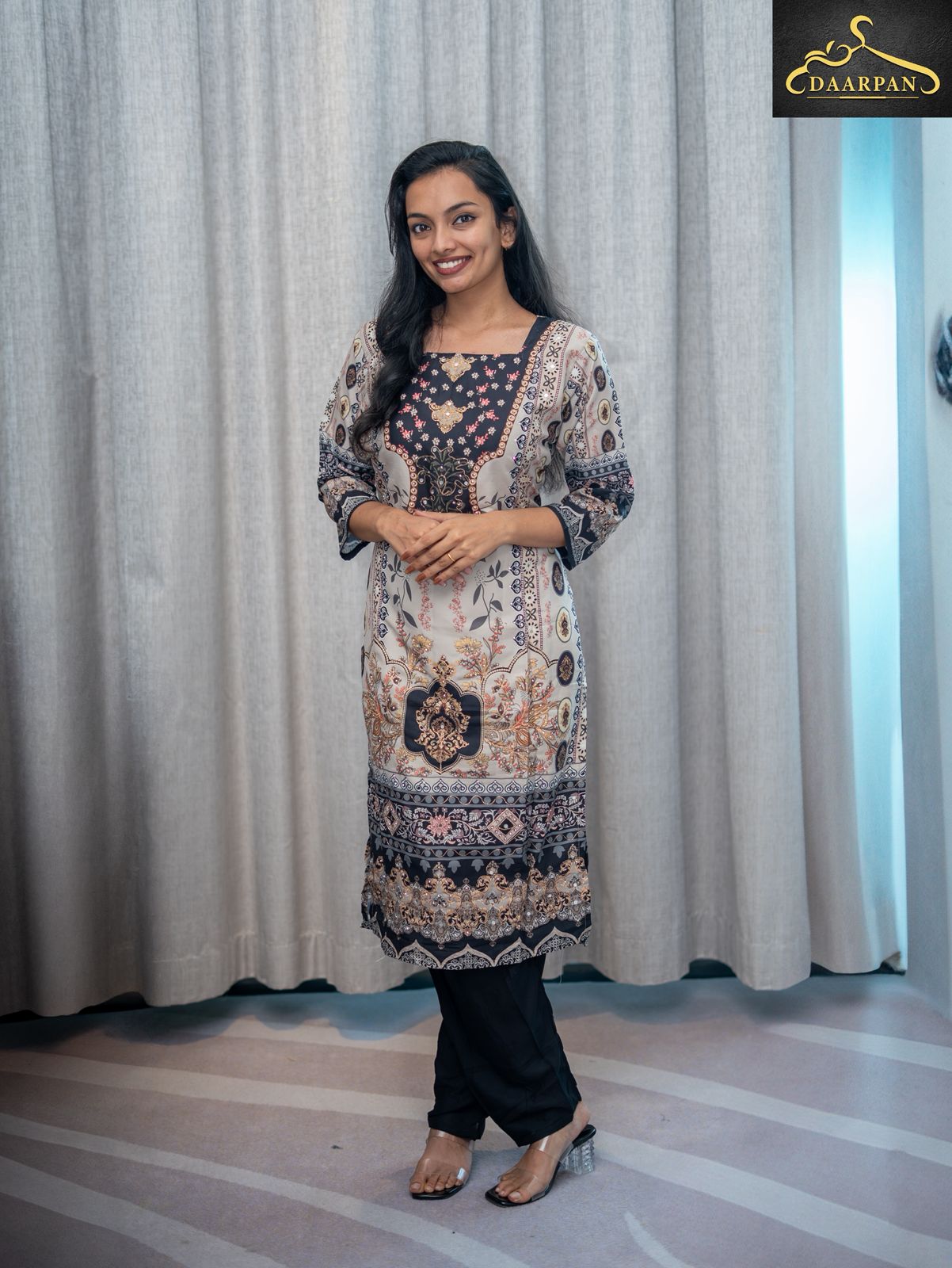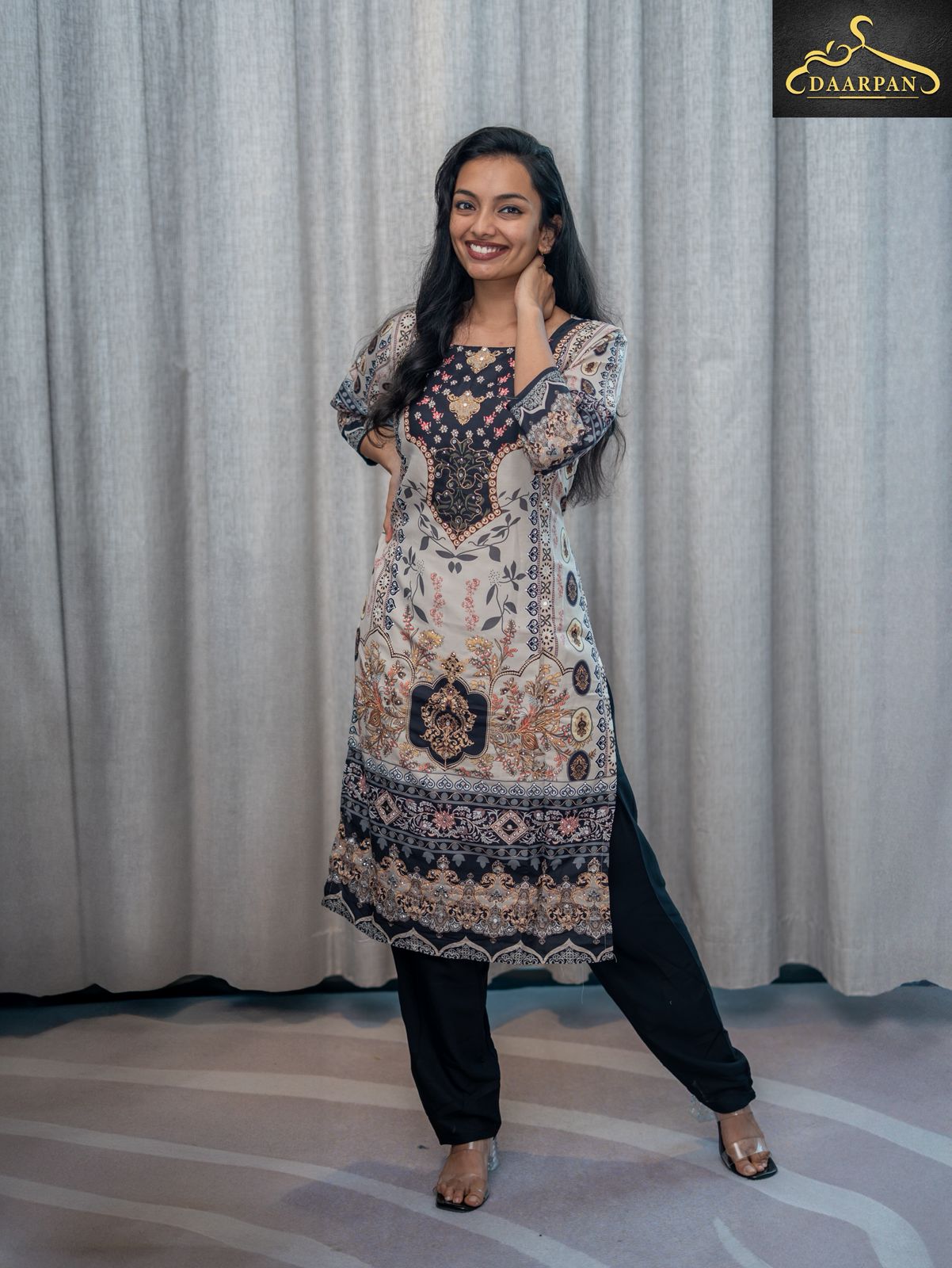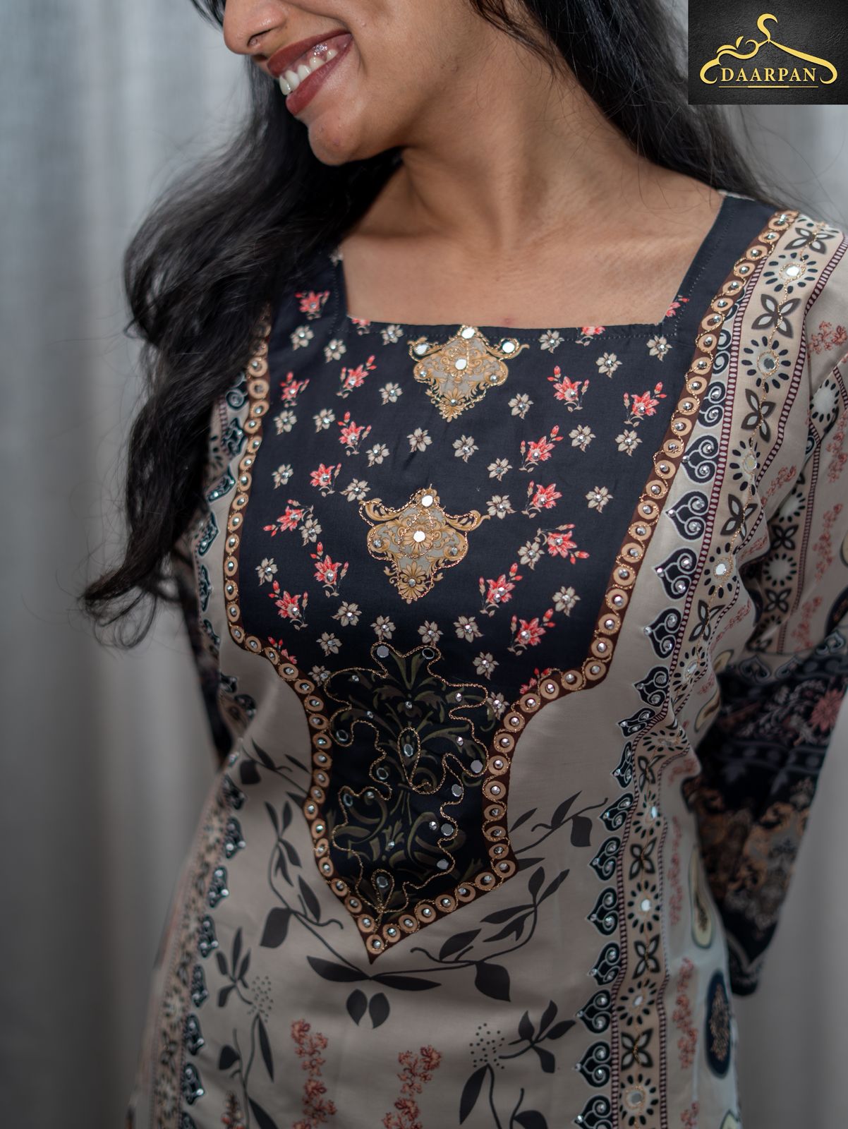 •The kurta features a multi-patterned print in shades of black, beige, and subtle gold accents, giving it a rich and elegant look.