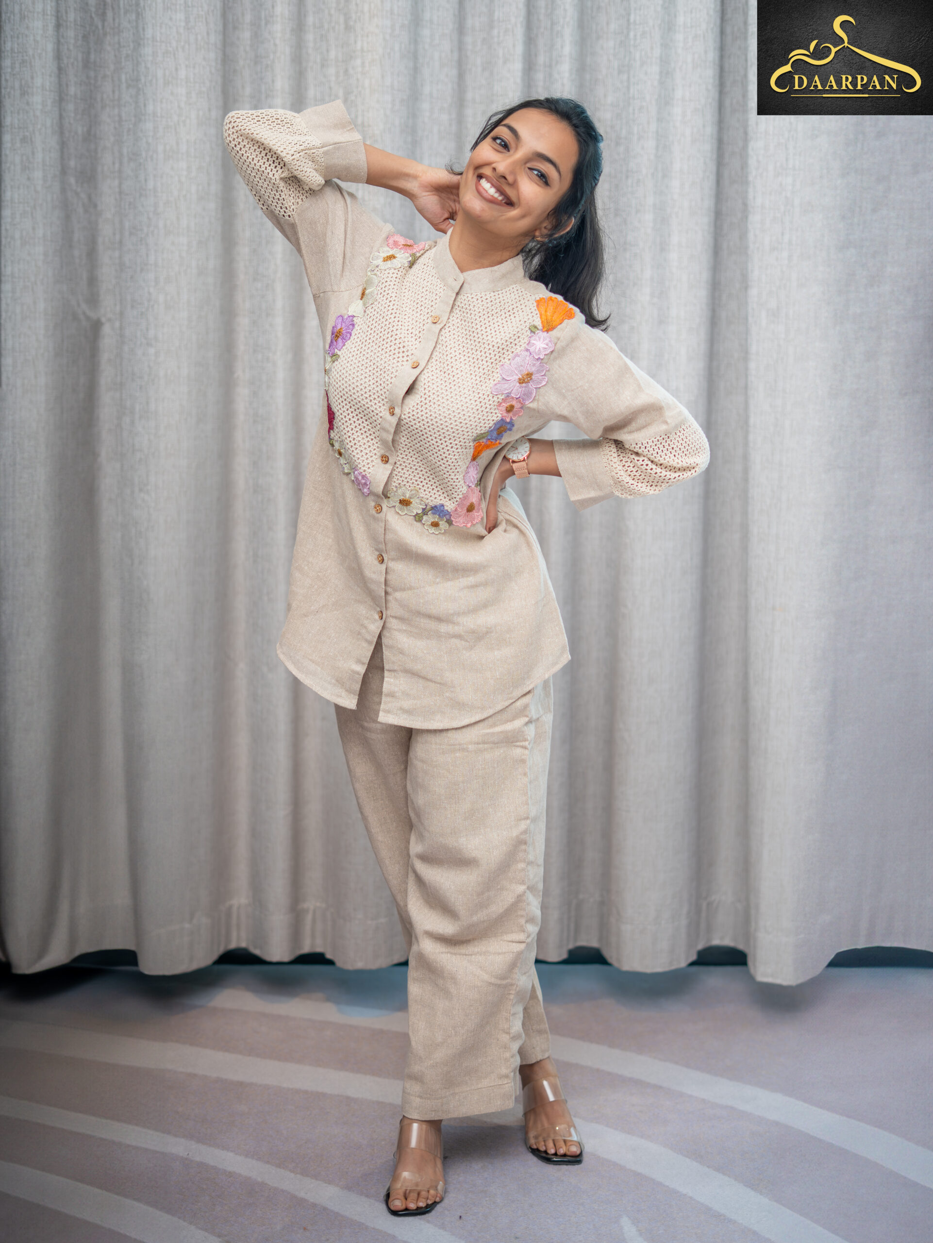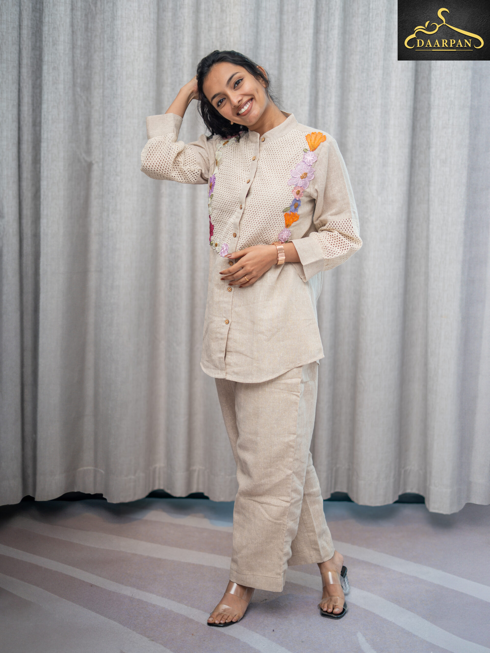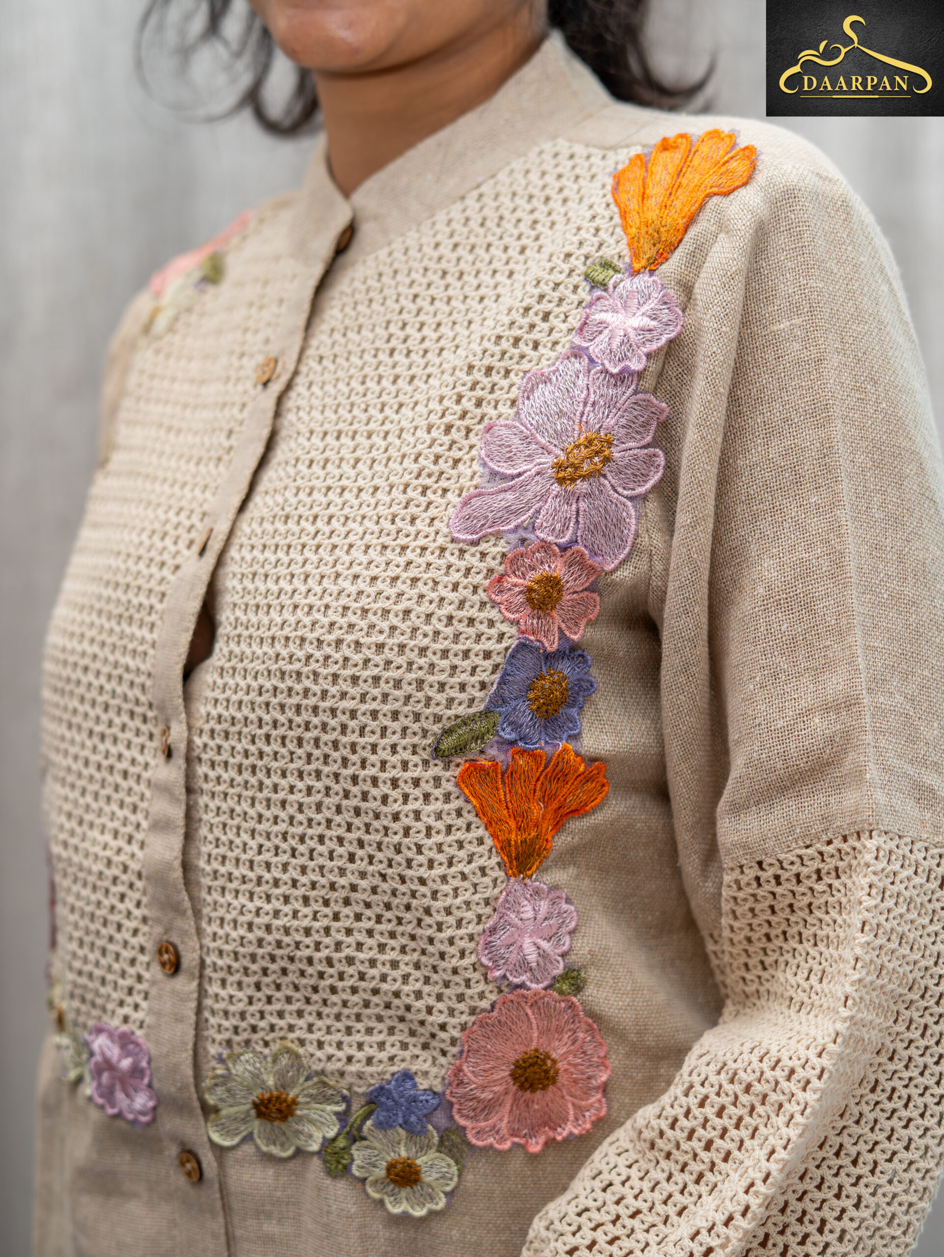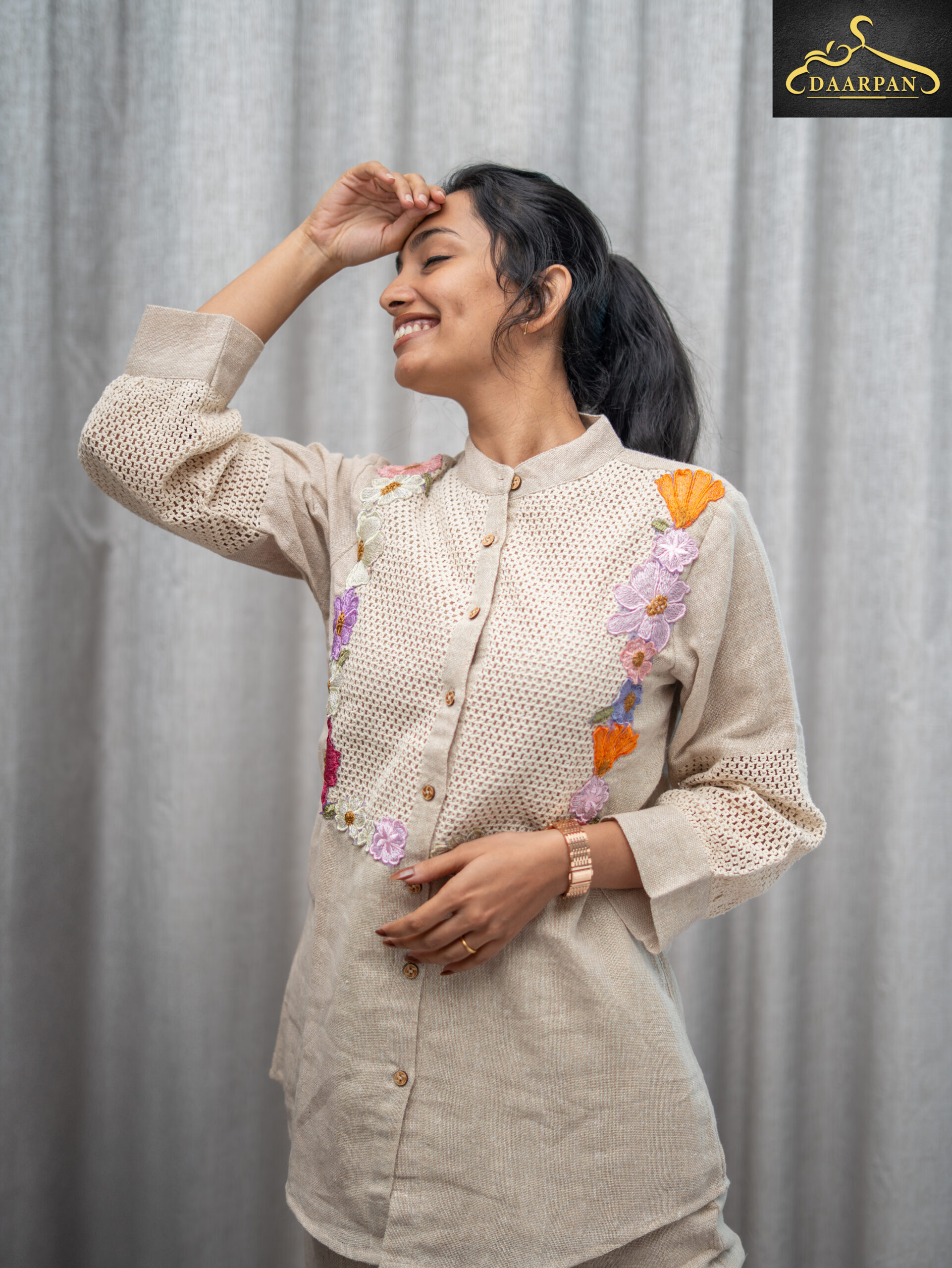 Fabric & Color: The outfit appears to be made from a light, breathable fabric in a neutral beige tone, ideal for casual and semi-formal wear. Design: Top: The top has a structured yet relaxed fit with full sleeves, a high collar, and front button closure. Details: There’s a stylish use of crochet/net fabric on the upper part with delicate floral embroidery in pastel colors, adding a feminine and artistic touch. Bottom: Straight-cut pants in the same fabric give it a coordinated and minimalistic appeal. Style: The outfit blends modern tailoring with traditional handcrafted elements, making it versatile for day events, office wear, or casual gatherings